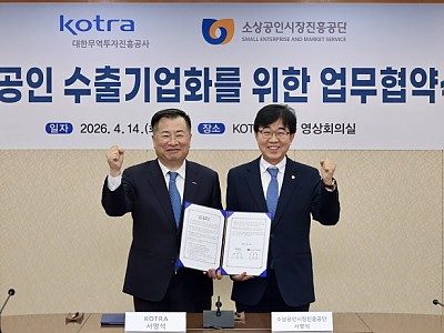수출 유망 소상공인 발굴·해외시장 진출까지 협력체계 구축을 위한 업무협약 체결 지역 수출협의체 운영·B2B 플랫폼 연계 등 전국 단위 수출지원 기반 마련소상공인시장진흥공단(이하 소진공)은 대한무역투자진흥공사(이하 코트라)와 14일 서울 서초구 코트라 본사에서 ‘소상공인 수출기업화를 위한 업무협약’을 체결했다. (사진=소진공)(뉴스9=이호철기자)소상공인시장진…