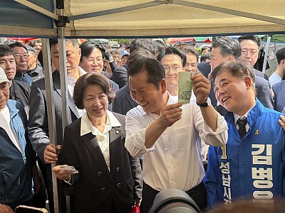 정청래,“대한민국 국가정상화, 일잘하는 지방정부”추미애,“민주주의를 지키기 위해서 민생이 정답”김병욱,“모란전통5일장은 이 대통령의 실용정치의 상징”더불어민주당은 19일 오후 정청래 대표가 영남권과 서울에 이어 이재명 대통령의 정치적 고향인 경기 성남시를 성남시 모란시장을 찾아 추미애 경기도지사 후보 지원했다. (사진=뉴스9)(뉴스9=이호철기자) 6월 지방…