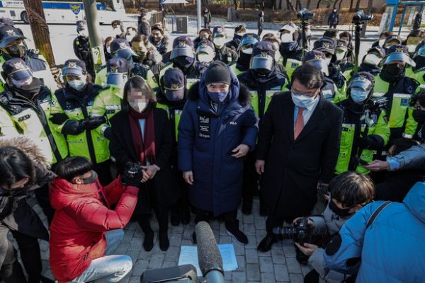 2020년 9월 서해상에서 북한군 총격에 숨진 해양수산부 공무원의 부인 A씨(왼쪽)와 형 이래진 씨(가운데), 법률대리인 김기윤 변호사가 18일 오전 서울 종로구 청와대 분수대 앞에서 기자회견을 마친 뒤, 사건 발생 당시 문재인 대통령이 실종 해수부 공무원 아들에게 보낸 편지를 반환하기 위해 청와대 업무동으로 향하다 경찰에 저지되고 있다.