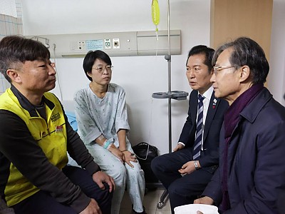 단식 27일차, 아사단식 4일차,홈플러스 노조 지도부 3인, 단식중단 발표홈플러스 사태 해결에 대한 정부와 여당의 입장과 의지를 확인…홈플러스 정상화의 마지막까지 뚜벅뚜벅 걸어갈 것…마트노조는 정부 개입을 촉구하며 이어온 아사단식을 중단한다고 밝혔다. 4일 오전 녹색병원 입원중인 홈플러스 안수용 지부장과 마트노조 강우철 위원장(왼쪽)과 정청래 민주당 대표,…