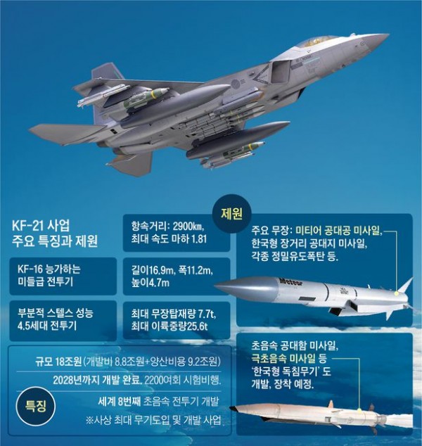 KF-21은 다양한 국산 및 외국제 미사일·폭탄으로 무장한다. 공대공 미사일은 유럽제인 미티어 중거리 미사일과 AIM-2000/IRIS-T 단거리 미사일을 장착한다. 유럽 MBDA가 개발한 미티어 공대공 미사일은 음속의 4배가 넘는 속도로 200㎞ 떨어져 있는 적 항공기를 격추할 수 있다. 이런 성능을 가진 공대공 미사일은 일본에는 아직 없고 중국·러시아 정도만 갖고 있어 동북아 최강급(級)으로 평가된다.
