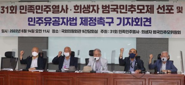 6월 14일 오전 31회 민족민주열사·희생자 범국민추모제 선포 및 민주유공자법 제정촉구 기자회견이 열린 서울 여의도 국회 의원회관 제9간담회실에서 참석자들이 구호를 외치고 있다.