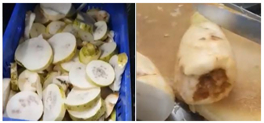 A씨가 지난해 10월부터 지난 1월까지 촬영한 영상에 따르면, 작업자들은 변색 돼 거뭇거뭇한 배춧잎을 벗겨 냈다. 무는 안쪽이 갈변하거나 단면에 보라색 반점이 가득했고, 하얀 곰팡이도 관찰됐다.