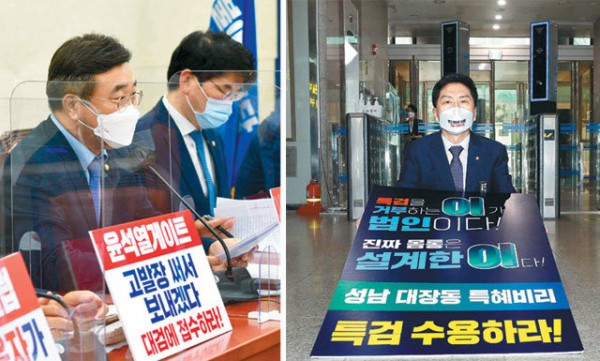 與 “고발사주 규명” vs 野 “대장동 특검” 여야 지도부가 7일 ‘대장동 의혹’과 ‘고발사주 의혹’을 두고 맞붙었다. 더불어민주당 윤호중 원내대표와 박완주 정책위의장(왼쪽 사진 왼쪽부터)이 이날 국회에서 열린 국정감사 대책회의에서 ‘윤석열 게이트’라고 적힌 팻말을 앞세운 채 발언하고 있다. 오른쪽 사진은 이날 서울 서대문구 국가수사본부에서 대장동 의혹의 특검 수용을 촉구하며 1인 시위를 벌인 국민의힘 김기현 원내대표. 사진공동취재단.