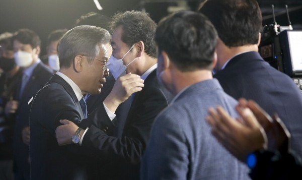 더불어민주당 대통령 후보에 선출된 이재명 지사가 지난 10일 송파구 올림픽공원에서 열린 서울 합동연설회를 마치고 이낙연 전 대표와 포옹하고 있다. 국회사진기자단.