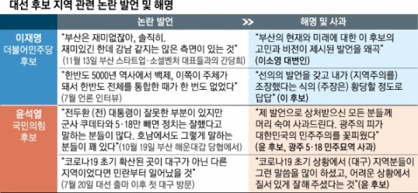 하지만 후보들이 지역과 관련해 논란이 될 수 있는 발언을 하면 정치 공방으로 이어져 정책 논쟁을 하기는 더 어려워진다는 우려가 나온다. 실제 이 후보는 지난 7월 이른바 ‘백제 발언’으로 당내 경선 경쟁자들과 맞붙었다. 이 후보는 당시 언론 인터뷰에서 “백제가 주체가 돼 한반도 전체를 통합한 때가 없었다”고 발언했고, 경쟁자였던 이낙연 전 민주당 대표는 “호남 출신 후보의 확장성을 문제 삼은 중대한 실언”이라고 불쾌해했다. 윤 후보도 지난 10월 당내 경선 과정에서 ‘전두환 옹호’ 발언을 한 후 당내에서 비판을 받다가 지난 10일 광주를 찾아 고개를 숙였다.