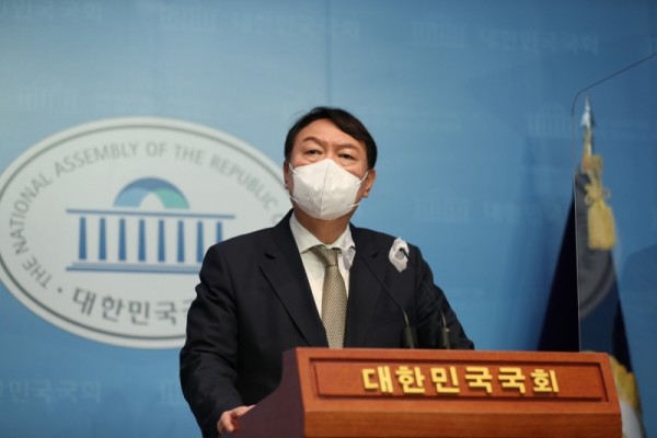 ▲국민의힘 소속 대선 예비후보 윤석열 전 검찰총장이 22일 오전 국회 소통관에서 언론중재법 개정안을 비판하는 기자회견을 하고 있다. 사진=윤석열 캠프