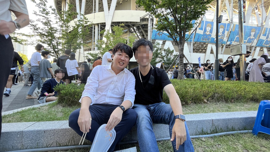 국민의힘 이준석 전 대표가 27일 대구 북구 디지비(DGB)대구은행파크 중앙광장에서 열린 ‘대구 떡볶이 페스티벌’을 찾은 시민과 기념 촬영을 하고 있다.