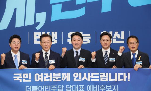 더불어민주당 대표 예비후보들이 지난 19일 국회에서 열린 민주당 당대표 후보자 포토섹션에서 포즈를 취하고 있다. 이동학(왼쪽부터), 이재명, 강훈식, 강병원, 박주민 당대표 예비후보.
