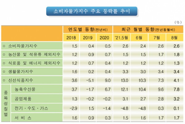 실제, 통계청이 매월 발표하는 소비자물가지수 상승률은 4월 2.3%를 시작으로 5월 2.6%, 6월 2.4%, 7월 2.6%, 8월 2.6% 등 잇따라 높은 수치를 이어가고 있다. 한국은행의 물가안정 목표치가 2.0%이고, 올해 초 정부가 발표한 목표치가 1.8%인 점과 비교하면 간극이 크게 벌어졌다.
