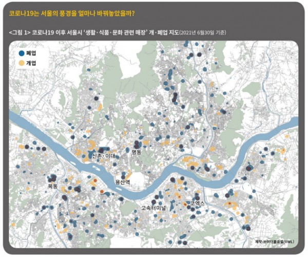 팬데믹은 서울 도심 곳곳의 풍경을 뒤바꿔놓았다. 〈HBS뉴스광장〉은 도시 데이터 분석·시각화 전문업체 브이더블유엘(VWL)과 함께 코로나19로 인한 사회적 거리두기 정책이 자영업자들에게 미친 영향을 공간 중심으로 파악해보았다. 행정안전부가 제공하는 ‘지방행정 인허가 데이터’에 등록된 190개 업종 중 일상생활과 가까운 식품·생활·문화 관련 업종, 그중에서도 미용업, 노래연습장, 일반음식점 등 불특정 다수의 사람들이 방문하는 63개 업종을 추려 개·폐업 실태를 조사했다(그 결과가 위 〈그림 1〉이다). 서울 내 지난해 1월 이후 개업이 많았던 지역(노란색)과 폐업이 많았던 지역(파란색)을 지도에 각각 표시했다. 폐업하는 가게가 유독 많았던 지역은 검은색으로 나타냈다. 강북 지역에서는 이대 앞, 신촌, 명동, 용산역 부근 등에, 한강 이남 지역에서는 고속터미널역, 목동, 코엑스 인근 등에 폐업이 집중되었다.