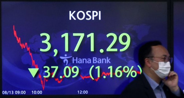 지난 13일 오후 서울 중구 하나은행 딜링룸에서 딜러들이 업무를 보고 있다. 이날 코스피 지수는 전날보다 37.09p(1.16%) 내린 3,171.29 에 거래를 마쳤다.