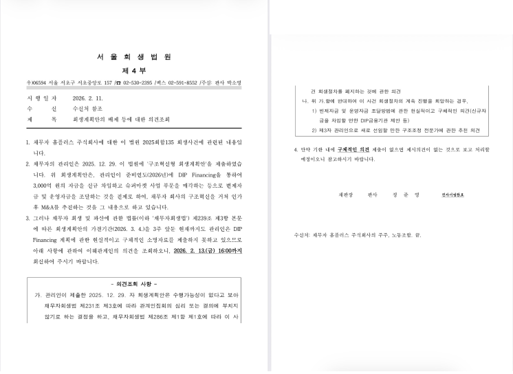 이에 법원은 2026년 2월 11일, 홈플러스 노동조합에 공문을 보내 다음과 같은 사항에 대한 공식 의견을 요청했다.