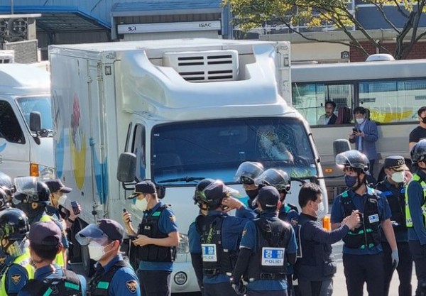 18일 오전 대구 달서구 성서공단 내 SPC 물류센터 입구에서는 빵을 운송하기 위해 이동 중이던 화물차 기사 A씨의 차량에 민노총 조합원이 맨몸으로 뛰어올라, 머리로 앞유리를 들이받아 깨뜨렸다. 화물차 앞유리는 야구공을 맞은 것처럼 박살이 났다. A씨는 “공격 당하는 순간 유리 파편이 운전석으로 쏟아져 들어왔고, 정신이 멍했다”며 “엊그제는 노조원들이 차 뒷부분을 벽돌로 찍고 달아났다. 경찰이 앞에 뻔히 지키고 서 있는데 이런 일들이 벌어지니 황당하다”고 했다.