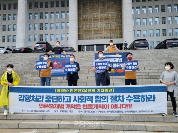 언론 현업 4단체는 24일 오후 2시 정의당과 함께 서울 여의도 국회 본청 앞에서 ‘강행처리 중단하고 사회적 합의 절차 수용하라-언론중재법 개악은 언론개혁이 아니다’ 기자회견을 열었다.