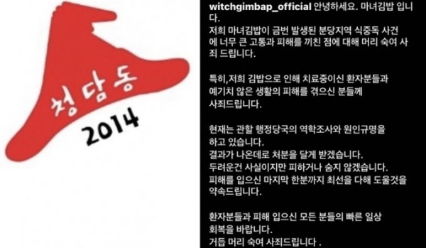 김밥 프랜차이즈 '청담동 마녀김밥'이 최근 분당에 위치한 두 지점에서 134명의 식중독 환자가 발생한 것에 대해 사과했다.