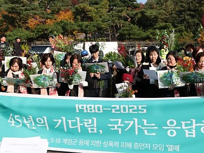 “우리 몸이 역사의 현장, 진실의 증거” 5·18 성폭력 생존자, 국가 상대 첫 소송 시작44년 만에 처음 만난 5·18 성폭력 피해자들5·18 계엄군 등에 의한 성폭력 피해 증언자 모임 ‘열매’ 로 연대5·18 계엄군 등에 의한 성폭력 피해 증언자 모임 ‘열매’ 와 연대자들이 7일 서울중앙지방법원에서 첫 재판 관련 기자회견을 하고 있다. (사진=뉴스9)(…