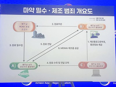 인천공항세관, MDMA 원료 밀수입·국내 제조 조직 점거마약 원료물질 밀수입 추적 끝에 마약 제조 시설 적발·압수주택가 한복판에 마약 제조시설 차려 마약 제조한 베트남인 3명 구속인천공항세관은 17일 오전 인천공항세관 화물청사에서 국내에서 MDMA를 제조한 베트남 국적 마약조직원 3명을 「마약류관리에 관한 법률」 위반 협의로 검거하며 인천지방검찰청에 각각 …
