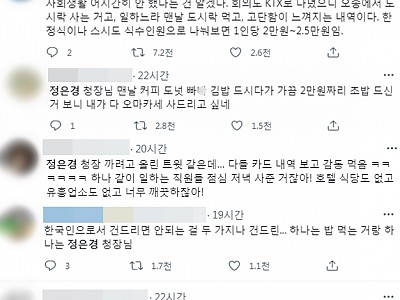 네티즌들 “고단함이 느껴진다” 안쓰럽단 반응 “맛있는 것 좀 사드시라” 응원 목소리 이어져 정은경 질병관리청장이 사용한 올해 6월 업무추진비 사용내역이 온라인에서 공개된 뒤 “고단함이 느껴진다” “맛있는 것 좀 사드시라” 등의 응원이 줄을 잇고 있다. 지난 14일 한 트위터 이용자가 올린 정 청장의 6월 업무추진비 사용내역이 16일까지 온라인을 뜨겁게 달구…