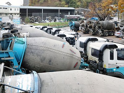 2021년 11월 8일 오전 경기 파주시 한 레미콘 공장 주차장에 트럭들이 가득 주차돼 있다. 최근 레미콘 트럭들 중에선 요소수를 구하기 힘들어 장거리 운행을 포기하는 사례가 잇따르고 있다. 요소수 대란의 피해는 건설업뿐 아니라 물류, 운송, 건설, 정유 등 전(全) 산업 분야로 확산하고 있다. 디젤 엔진 차량에 필수적으로 들어가는 '요소수' 품귀 현상이 …