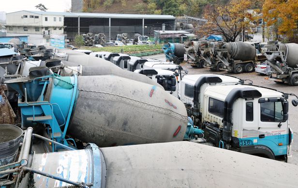 2021년 11월 8일 오전 경기 파주시 한 레미콘 공장 주차장에 트럭들이 가득 주차돼 있다. 최근 레미콘 트럭들 중에선 요소수를 구하기 힘들어 장거리 운행을 포기하는 사례가 잇따르고 있다. 요소수 대란의 피해는 건설업뿐 아니라 물류, 운송, 건설, 정유 등 전(全) 산업 분야로 확산하고 있다.