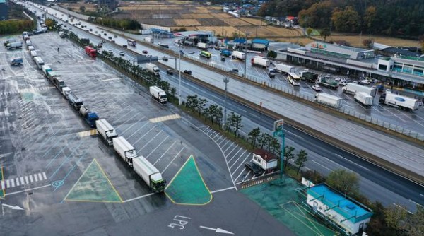 디젤 엔진 차량에 필수적으로 들어가는 '요소수' 품귀 현상이 빚어지고 있는 11월 8일 오후 경기도 여주시의 한 고속도로 양방향 휴게소 주유소에 트럭들이 요소수를 넣기 위해 길게 줄을 서 있다.