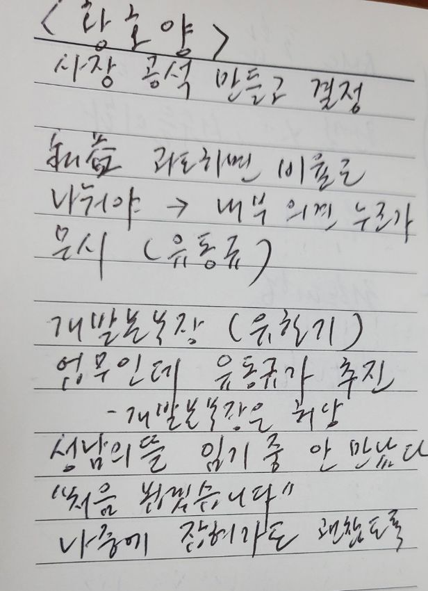 국민의힘 박수영 의원이 지난 20일 황호양 전 성남도시개발공사 사장을 면담하며 작성한 메모(왼쪽). 메모에는 ‘(특정 세력이) 전임 사장을 공석으로 만들고 대장동 개발을 결정했다’ ‘사익이 과도하면 조정해야 한다는 내부 의견을 누군가 무시했다’ ‘대장동 개발은 개발본부장 업무인데 기획본부장인 유동규씨가 추진했다’ ‘나중에 (검찰에) 잡혀가도 괜찮도록 성남의뜰 관련 인사들을 임기 중에 안 만났다’는 등의 내용이 적혀 있다. /독자 제공