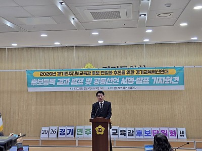 누가 후보 되느냐보다 어떤 경기교육 선택하느냐가 중요임태희 교육 체제 4년 심판론 부각경기교육혁신연대에 단일화 과정 ‘정책 공론화 장’ 마련 요청4일 경기도의회 브리핑룸에서 거행된 경기교육혁신연대 주최 ‘경기도교육감 민주진보단일화 기자회견’ 성기선 예비후보.(사진=뉴스9)(뉴스9=이호철기자) 2026년 지방선거를 앞두고 경기도교육감 민주진보 진영의 단일화 …