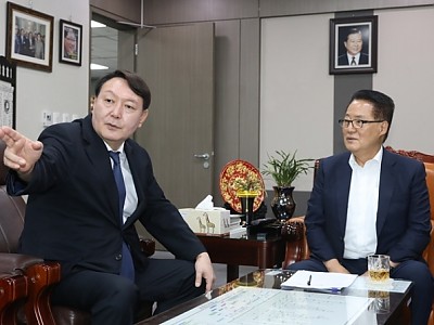 2019년 8월7일 당시 윤석열 검찰총장이 서울 여의도 국회 의원회관에서 민주평화당 박지원 의원을 예방하고 있는 모습. ‘따로 마신 적 없다’ 尹 주장 재반박 尹 “朴, 다시 한번 잘 생각해봤으면” 국민의힘 의원들, 국정원 항의 방문. 박지원 국가정보원장이 국민의힘 윤석열 대선 경선 후보가 자신과 술을 마신 적이 없다고 부인한 것에 “기억이 가물가물한 거 …