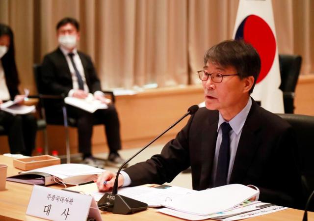 장하성 주중대사가 지난해 국회 국정감사에서 의원 질의에 답변하고 있다.