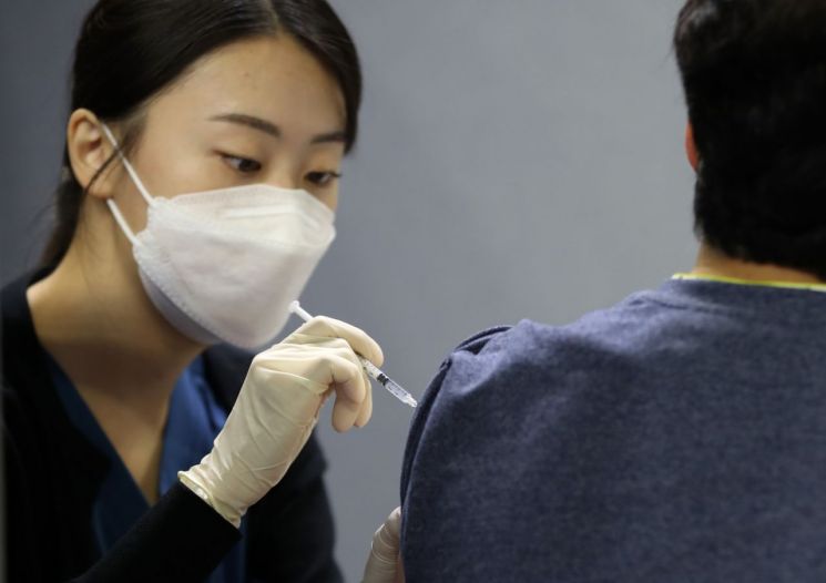 지난 17일 오전 서울 동작구 예방접종센터가 설치된 사당종합체육관에서 의료진이 시민에게 백신 접종을 하고 있다.