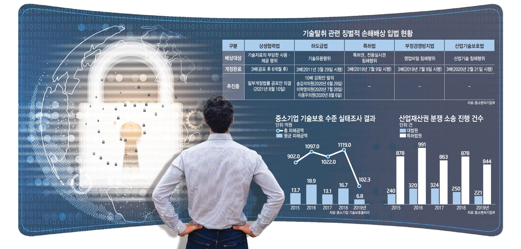 대기업 대비 중소기업 기술 보호 역량은 크게 부족하다. 중소벤처기업부에 따르면 2019년 기준 중소기업 기술보호 점수는 47.5점에 불과하다. 대기업의 69.3점, 중견기업의 66.8점에 비해 크게 떨어진다. 지난해 48.5점으로 소폭 상승했지만, 2016~2017년보다도 낮은 수준이다. 기술유출 사고가 발생하는 주된 이유도 △회사의 보안관리, 감독체계 미흡 △임직원의 보안의식 부족 △보안관련 투자 미흡 등이 꼽힌다. 근절 대책 안팎으로도 중소기업의 기술보호 실태는 크게 개선되지 않았다.