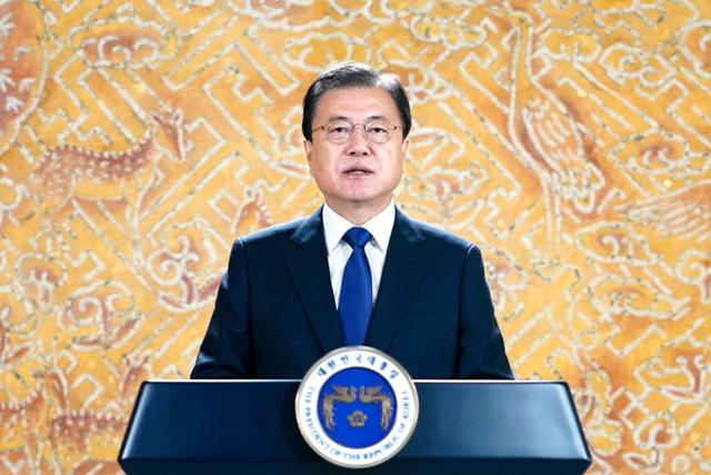 문재인 대통령이 14일 열린 일본군 '위안부' 피해자 기림의 날 기념식에 영상으로 기념사를 전하고 있다. 청와대 제공.