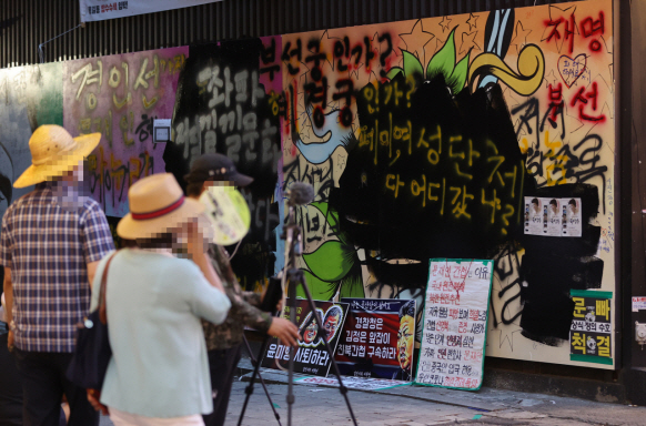 서울 종로구 관철동의 한 중고서점 앞에 윤석열 전 검찰총장 아내 김건희 씨를 비방하는 내용의 벽화가 게시돼 논란이 이어지는 가운데 한 유튜버가 벽화 위에 검은색 페인트로 덧칠했다. 사진은 지난달 31일 검은색 페인트로 덧칠된 벽화.