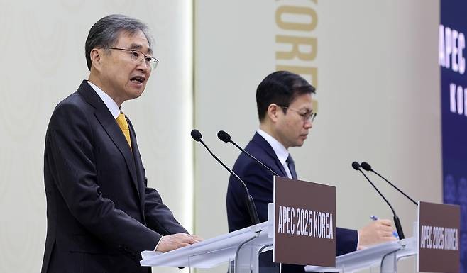 조현 외교부 장관과 여한구 산업통상자원부 통상교섭본부장(오른쪽)30일 경북 경주시 2025 아시아태평양경제협력체(APEC) 정상회의 국제미디어센터(IMC)에서 APEC 합동각료회의(AMM) 기자회견을 하고 있다.(사진=연합뉴스)