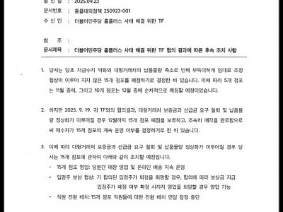 홈플러스 정상화를 위한다는 MBK 홈플러스의 모호한 태도..15개 점포 폐지 예정 보류에도 이후 점포는 혼란의 연속 ·출처: 홈플러스측이 지난 23일 민주당TF에 발송한 공문(뉴스9=이호철기자)더불어민주당은 지난 3월 을지로위원회(위원장: 민병덕 의원/안양 동안갑)산하에 ‘홈플러스 대책 TF’를 꾸려 활동을 해왔다 그러나 9월들어 홈플러스 본사가 전국 15…