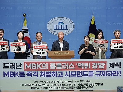 “홈플러스 본업은 무너지고 노동자·입점업주·투자자만 희생”“사법·금융당국 철저 수사와 강력한 사모펀드 규제 필요”(서울=뉴스9)=이호철기자 2025년 9월 25일, 국회 소통관에서 더불어민주당 을지로위원회와 진보당, 사회민주당, 홈플러스 사태 해결 공동대책위원회가 공동 기자회견을 열고 투기자본 MBK파트너스의 ‘먹튀 경영’을 강력히 규탄했다. 최근 더불어민…