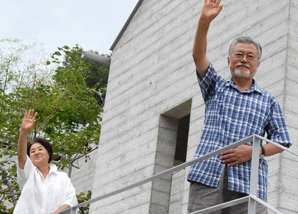 문재인 전 대통령과 김정숙 여사가 지난달 23일 경남 양산시 평산마을 사저 앞에서 보수단체 욕설 집회에 맞서 평화적 침묵시위를 이어가는 지지자들을 향해 손을 흔들고 있다. 전 청와대 행정관 SNS 캡처.