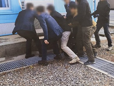 2019년 11월 7일 오후 판문점에서 탈북 어민이 강제 송환에 저항하다 쓰러진 것으로 추정되는 장면. 관계자 일곱명이 어민을 일으켜세우기 위해 접근한 모습. 통일부 제공. 2019년 11월 7일 오후 탈북 어민이 북송되기 전 판문점 내 대기실에 앉아 있는 모습. 안대를 쓰고 포승줄에 양 손이 묶인 모습이다. 통일부. 지난 2019년 자진 귀순 의사를 밝혔…