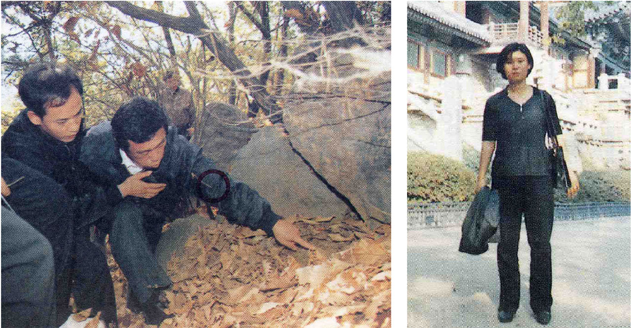 1997년 11월, 서울 관악구 장군봉 체육공원에서 드보크(공작 장비 매설 장소)를 발굴하고 있는 최정남(왼쪽)과 경주 불국사 앞에 선 강연정(오른쪽).