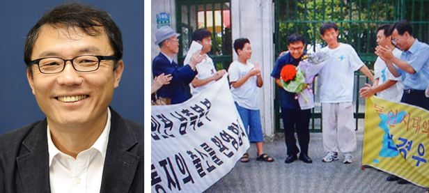 민경우 대표는 한때 주사파였고 간첩 혐의로 4년 2개월을 감옥에서 보냈다. 오른쪽 사진은 지난 2005년 그가 교도소 출소 때 동료들로부터 환영 받는 모습.