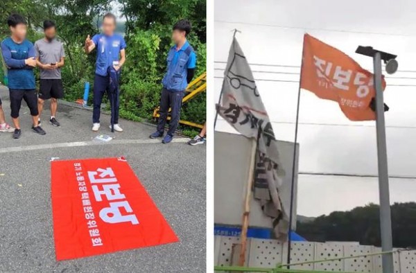 택배노조원들이 진보당 깃발을 펼쳐 놓은 모습(왼쪽 사진). 왼쪽에서 세 번째 인물은 최근 택배기사를 발로 차는 모습이 공개돼 논란이 된 택배노조 원모 부위원장이다. 택배노조는 택배터미널에 진보당 깃발을 걸기도 했다(오른쪽 사진). /독자 제공