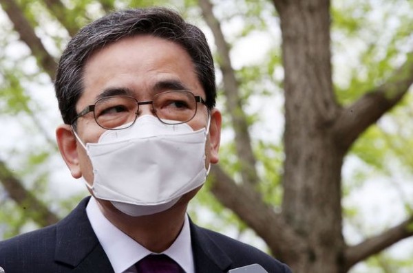 곽상도국민의힘 의원이 지난 4월 23일 오전 경기도 과천정부청사에 있는 공수처를 항의 방문하며 취재진의 질문에 답하고 있다.