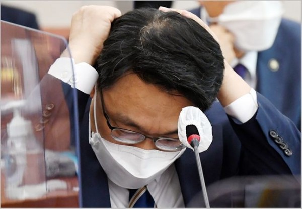 김진욱 고위공직자범죄수사처장이 지난 7월 국회 법사위 전체회의에 참석해 머리를 쓸어 넘기고 있다.