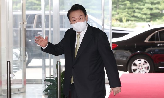 코로나19 감염을 우려한 경호처장의 건의도 소용이 없었다. 윤석열 대통령이 12일 잠정중단했던 도어스테핑을 하루 만에 재개했다. 전날 주차장과 연결된 통로로 출근해 기자들과 마주치지 않았던 윤 대통령은 예전과 같이 1층 로비로 출근했다. 평소 대통령과 1m 안팎의 거리를 두고 질문하던 기자들은 혹시나 모를 도어스테핑 가능성에 7~8m 정도 떨어져 윤 대통령을 기다리고 있었다.