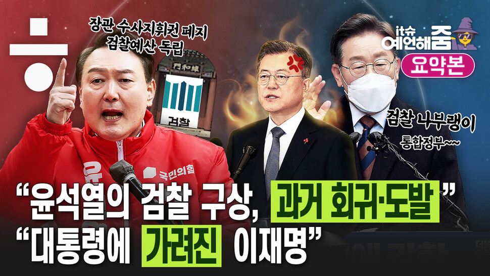 지난 14일 윤석열 국민의힘 대선후보가 사법 공약을 냈는데요. 법무부 장관 수사지휘권 폐지, 검찰 독립 예산 등이 주요 내용인데... 민주당 쪽에서는 “민주주의 파괴할지도 모르는 발상”이라며 날 선 비판을 하고 있고, 김민하 평론가도 “검찰개혁, 결국 한 발짝도 못 나가는 것”이라고 비판하는데요. ‘적폐수사 발언’ 논란에 이어 검찰 관련 공약을 낸 윤 후보의 속내는 무엇일까요?