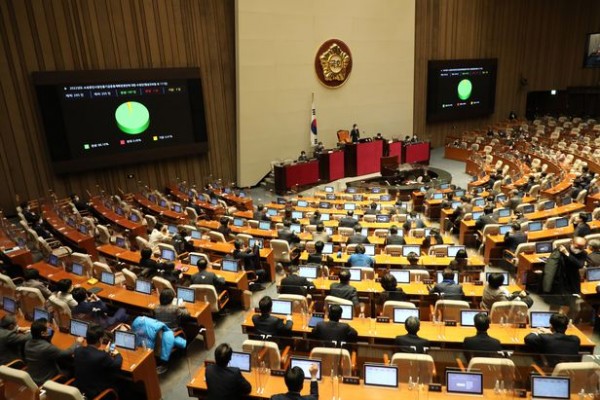 21일 오후 국회에서 열린 본회의에서 2022년도 소상공인시장진흥기금운용계획변경안에 대한 수정안이 가결되고 있다.