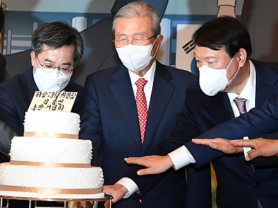 김종인 출판기념회 참석한 윤석열·김동연 - 국민의힘 윤석열(맨 오른쪽) 대선 후보가 15일 서울 용산의 한 호텔에서 열린 김종인(가운데) 전 비상대책위원장 출판기념회에서 케이크를 자르고 있다. 윤 후보는“김 전 위원장이 국가 대개조가 필요한 시점에 역할을 하셔야 될 때”라고 했다. 왼쪽은 김동연 전 부총리. /국회사진기자단 선대위 출범 앞두고 尹, 인사영입…