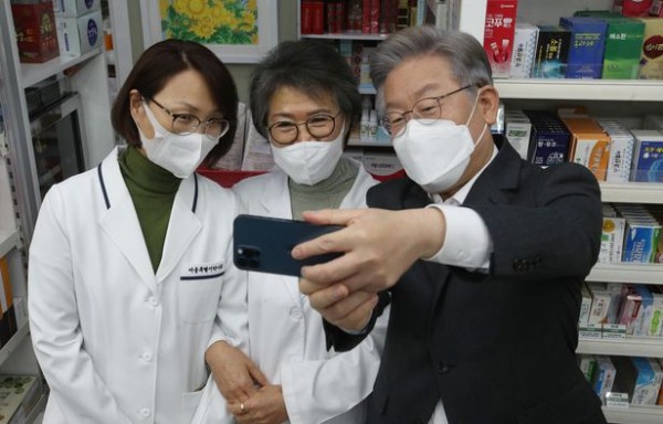더불어민주당 이재명 대선 후보가 27일 저녁 서울 마포구 망원동 공공 심야약국인 비온뒤숲속약국을 찾아 약사들과 기념촬영을 하고 있다.