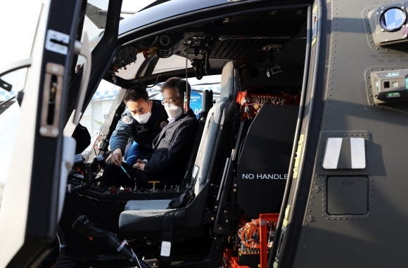 이재명 더불어민주당 대선 후보가 매타버스(매주 타는 민생버스) 순회 사흘째인 14일 경남 사천시 한국항공우주산업(KAI) 활주로에서 LAH 소형 무장헬기에 탑승하고 있다.